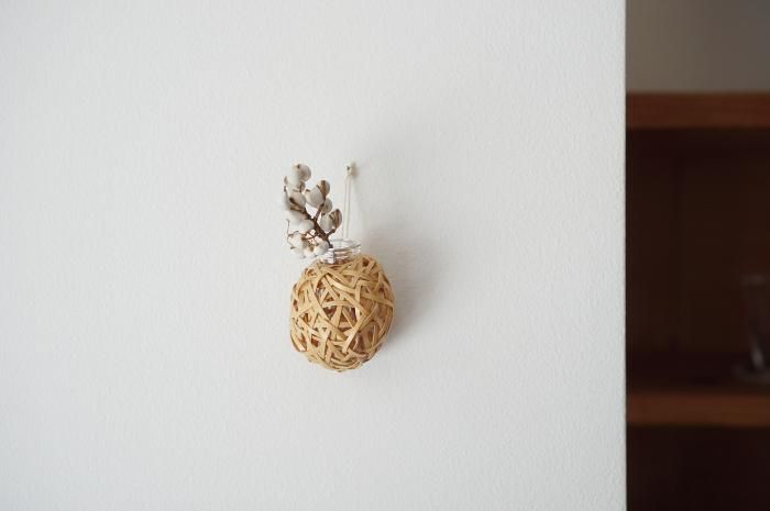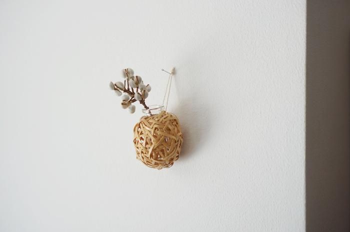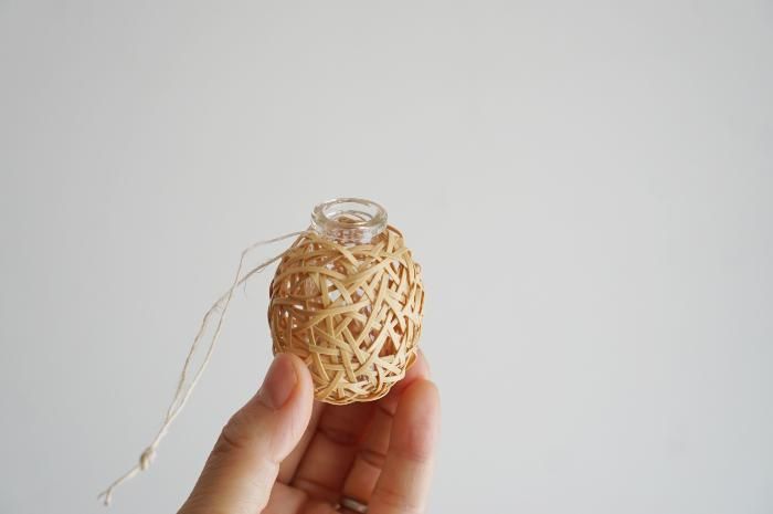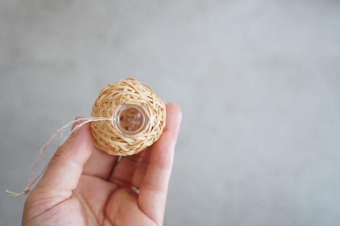 ちいさなガラス瓶を竹ひごでぐるぐる巻いた