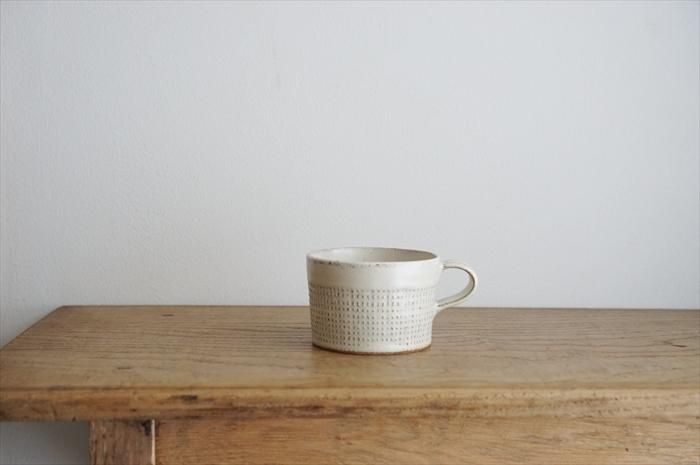 格子柄が入った口が広めのマグカップ。
